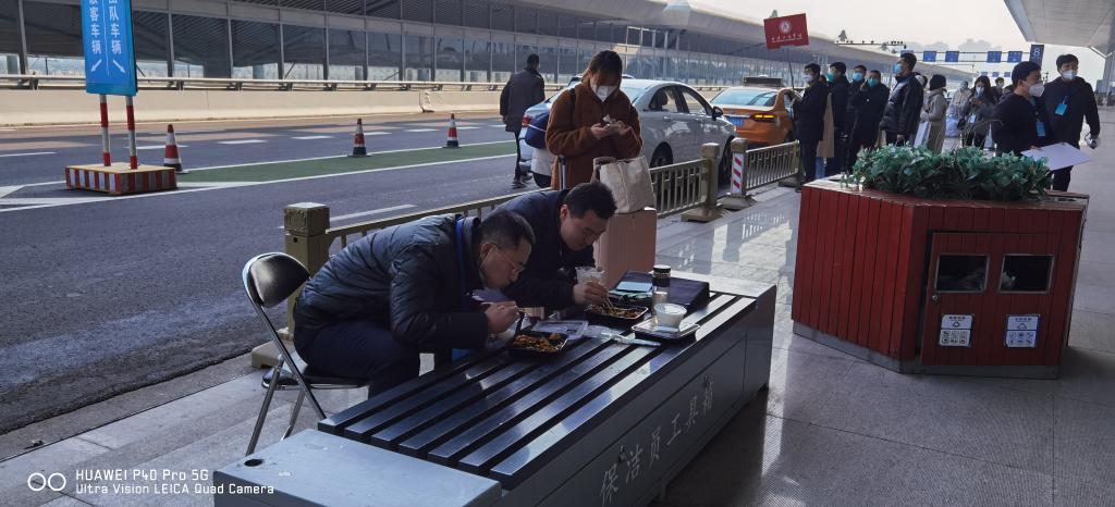 送一程,再送一程,在北客站出发平台呼啸的寒风中,校长李志健、化工学院党委书记张岩、党校办副主任李述麟在路边的长椅上吃完了冰冷的一餐。一辆陕科大的摆渡大巴刚到站,他们又放下盒饭,起来送又一批学子进站。