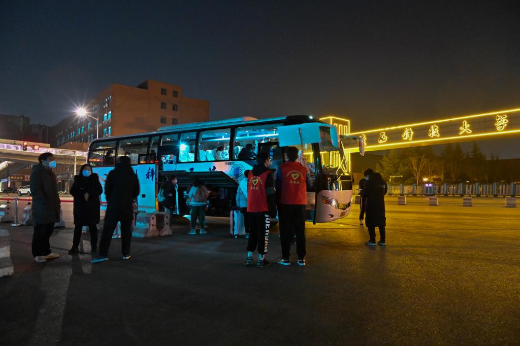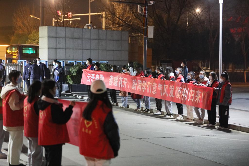 在运送保障组,30多名校卫队员日夜轮岗、全程保障学生的出行,他们凌晨四点就来到发车点,殷勤地提醒同学们带好行李、检查好所有必备的证明。