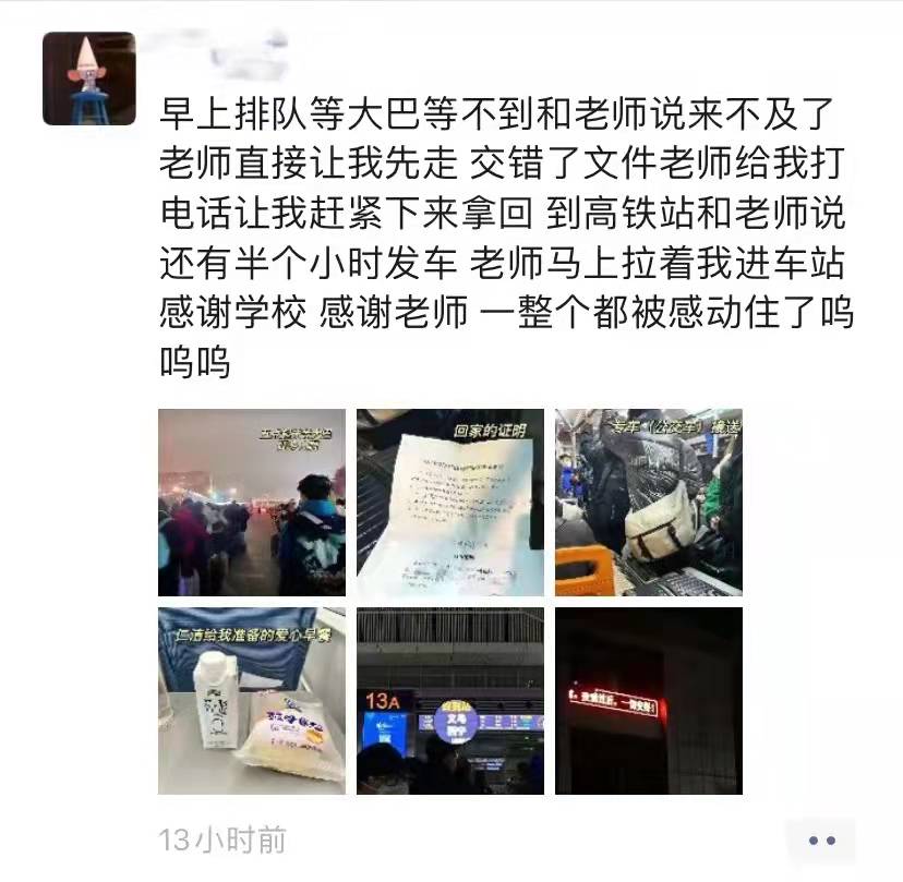 计算机201班的刘睿玲平安回到家后,在微信朋友圈写下这样的话语:“17号上午我坐上了学校安排的摆渡车,车上的志愿者们叮嘱大家检查随行的各种证明、行李,觉得心里很温暖,没想到北客站还有我们学校的老师护送我们进站,这次,我真真切切的感受到什么是‘科大温度’。”