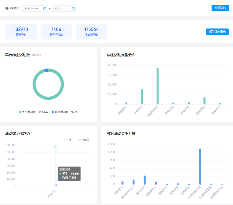 在强有力的服务支持下,任课教师多种教学方式组合上阵,通过超星学习通、雨课堂、慕课堂平台、腾讯会议、微信、QQ等软件,熟练运用线上课堂签到、讲解、测试、讨论和答疑等多种形式,加强在线互动。据悉,1月10日至11日雨课堂平台学生互动15894次,发布习题7162个;超星平台学生活动数331386次,学生完成任务点63996个。