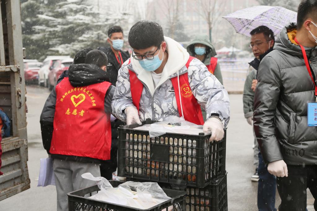 12月25日、26日,研究生抗疫青年突击队的志愿者们在进行研招考试的校园里迅速行动。中午考试结束的铃声一响,一双双风雪中冻得僵硬的手稳稳地搬起一个又一个装满盒饭的塑料筐,10分钟内饭菜精准送到110个校外考生考场的3000余名师生手中,保证每位考生和监考老师按时吃到热腾腾的饭菜。为了把疫情下校外考生用餐不便的问题解决好,为了确保午饭能准时、有序送到每个考场,志愿者们经过多轮培训,反复推敲每一个环节可能遇到的问题,制定了周密详细的服务方案。