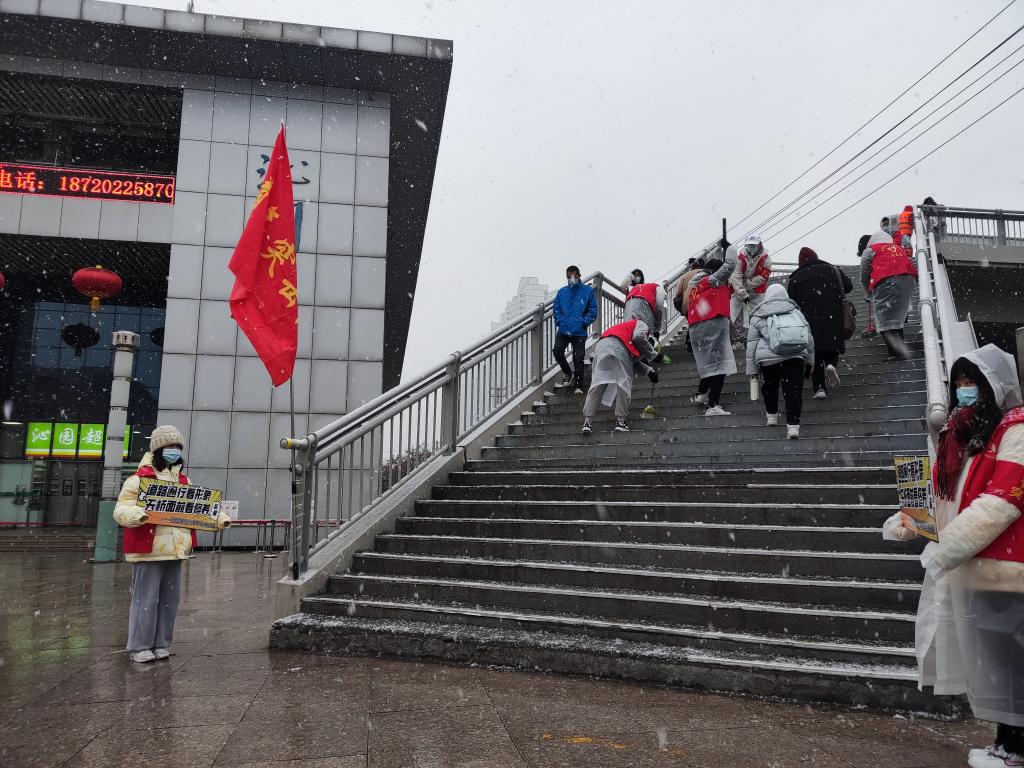 12月25日清晨,刚刚到达学校天桥的本科生抗疫青年突击队的志愿者们面对突降大雪,迅速反应。一队志愿者立即赶往距离最近的公寓楼,借来数套清扫工具清理天桥积雪;一队志愿者火速赶往沁园餐厅,借用大量食盐用作融雪剂紧急撒布。志愿者们神色匆忙,在天桥湿滑的台阶上,上上下下忙碌不停。他们在突发情况下的高效响应,避免桥面再次形成积雪,全力保障研考考生的及时安全通行。