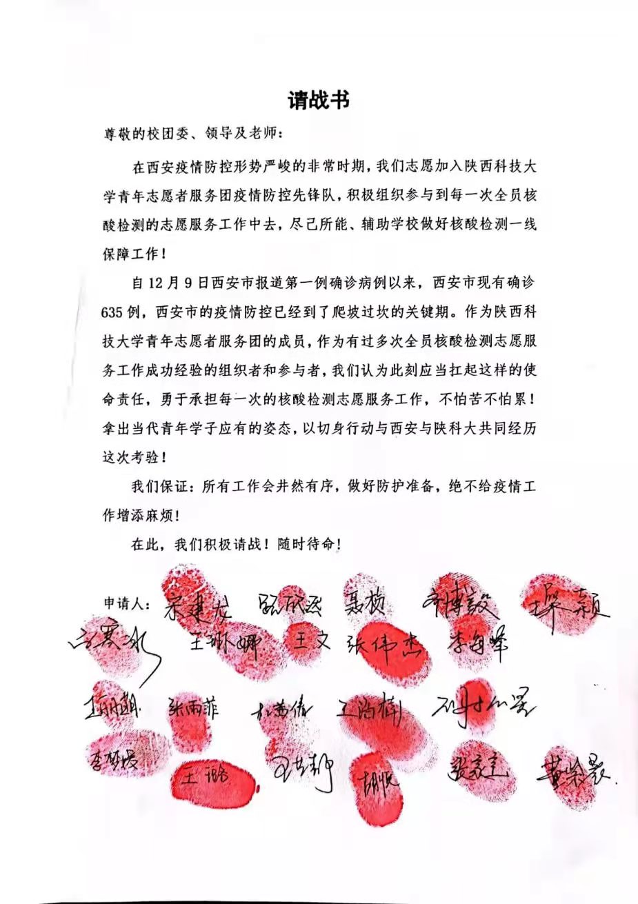 12月27日,学校青年志愿者服务团的70名志愿者向校团委递交请战书,信笺上,他们力透纸背的签名和“红手印”格外显眼。