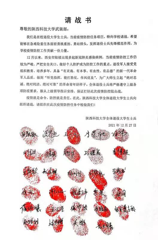 12月27日,随着西安市进一步强化疫情防控措施,学校武装部收到了一张按满“红手印”的请战书,这是365官网29名退役大学生士兵向学校提出的庄严申请。