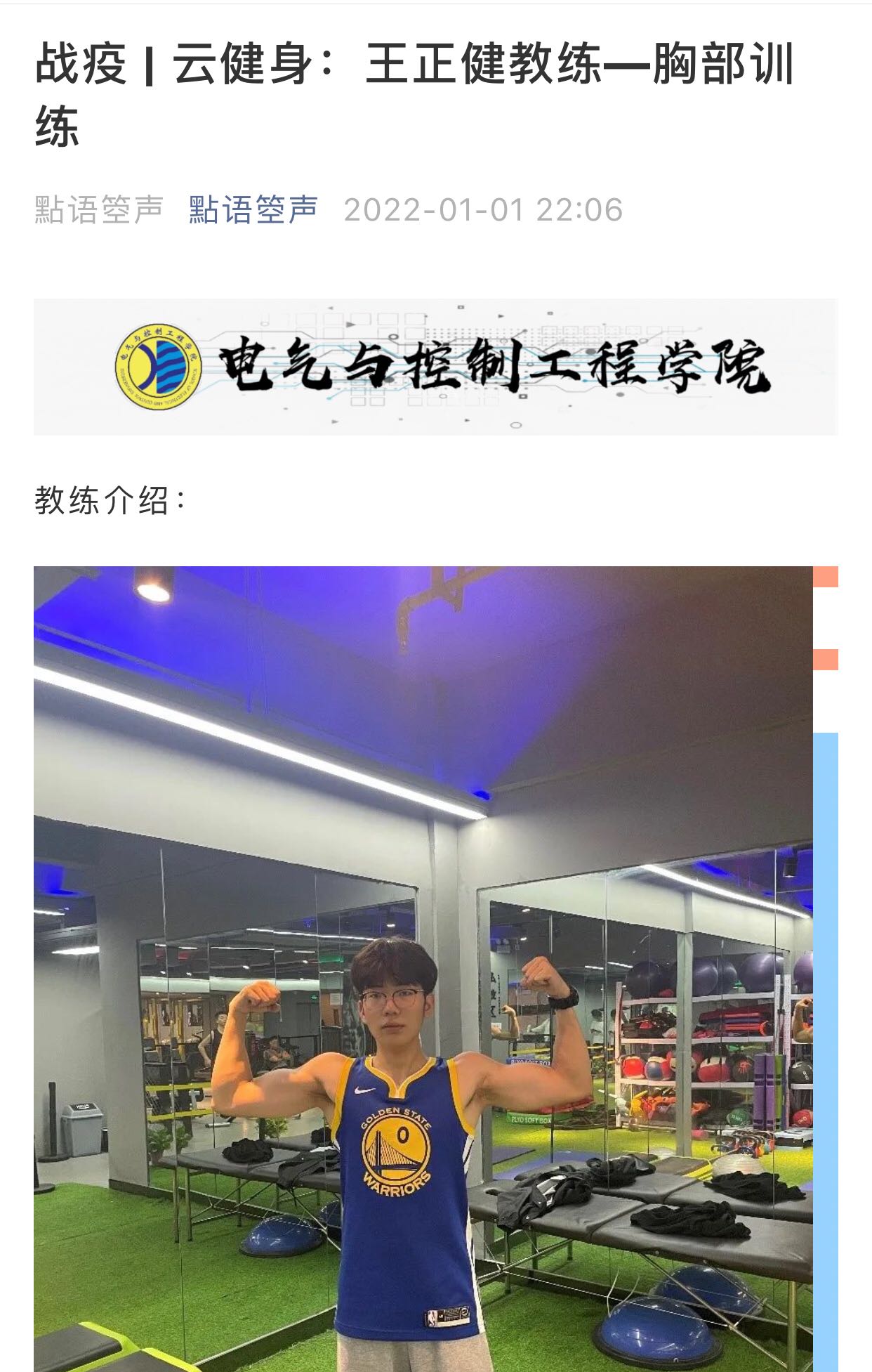 文明其思想,野蛮其体魄。疫情期间,电控学院的刘程林、王正健成为全校的“健身网红”。他们在电控学院微信公众号上开设了一个“战疫|云健身”的宿舍健身教程,通过短视频的方式鼓励大家不要做“肥宅”,即便封闭在宿舍里,用一些简单的器械也可以练出健美的体魄,用装满书的书包当哑铃,用上铺的栏杆做引体向上……他们的视频一推出,就被全校男生争相学习,因为很高的点击量,还被学习强国学习平台陕西平台转载。王正健愉快的说:“运动能促使身体分泌多巴胺,使我们自信、健康、快乐,在宿舍封闭期间,我们每天快乐地做运动、弹吉他,觉得生活比之前更充实了!”