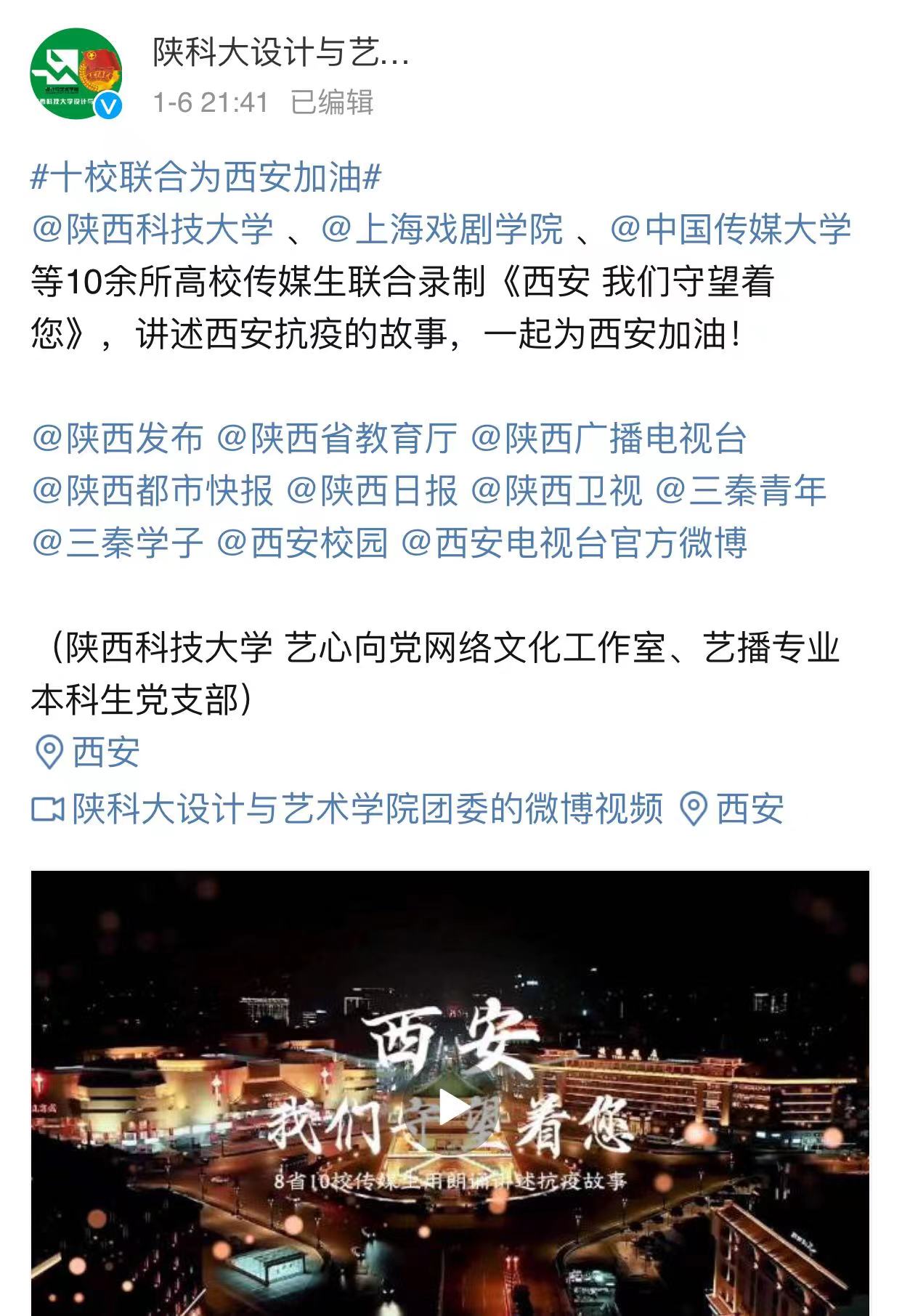 抗疫二十多天,设艺学院团委宣传部副部长谢骁珉废寝忘食地投入抗疫宣传中。12月24日在设艺学院团委微博公众号推出V-log《我在陕科大挺好的,不信你听——我用家乡话为西安加油》,点击量37万,被陕西电视台报道;1月6日联合陕西十所高校传媒专业的学生联合录制《西安 我们守望着你》短视频,连续两天排名西安同城热搜前十名,被陕西卫视、三秦青年、都市快报报道、转载……疫情期间,该院团委微博“涨粉”600多个。谢骁珉说:“在穆学慧、高凯老师指导下,我们‘艺心向党’工作室加班加点录视频、剪片子,每晚都忙到深夜,我们的初衷是给外地的家人朋友们报平安,想不到宣传效果这么好!”