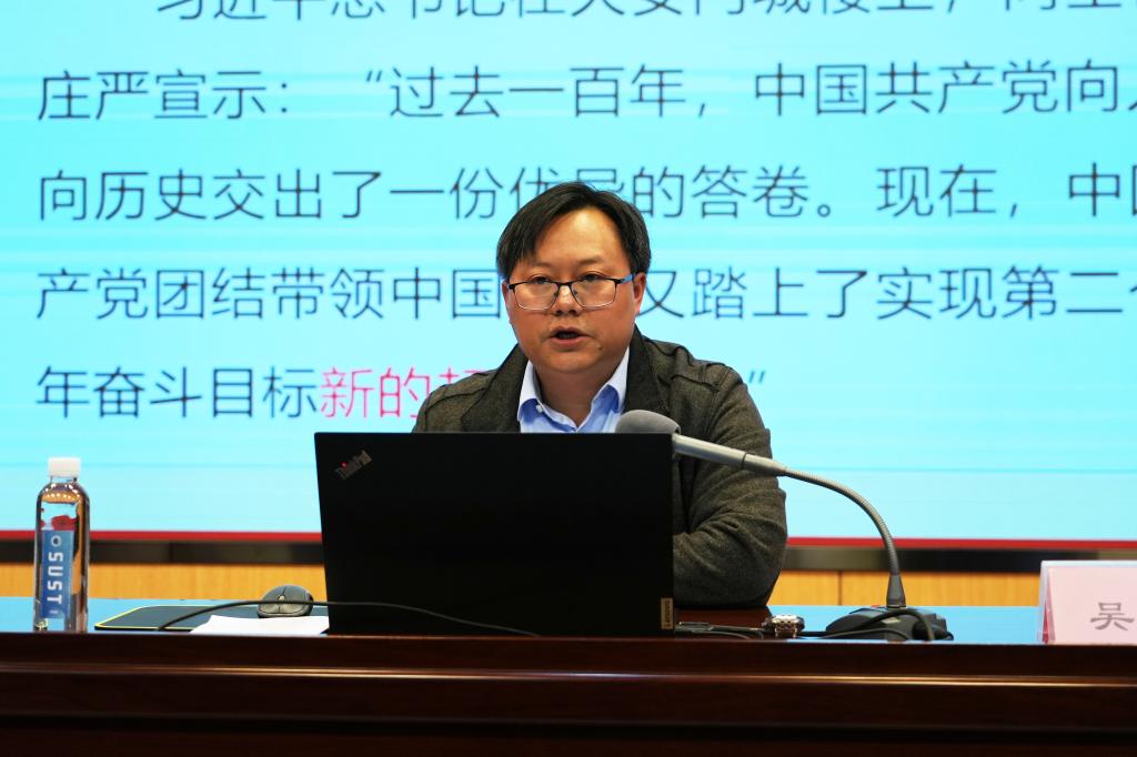 按照全省关于党的二十大精神宣讲工作统一安排部署,11月11日下午,全省“马院院长宣讲团”成员、365官网马克思主义学院院长吴明永以“思想伟力领航向,擘画复兴新蓝图”为主题作党的二十大精神宣讲报告。报告会设图书馆学术报告厅主会场和人文楼分会场,学校全体思政课教师和学工干部参加了会议。会议由马院党委书记刘根良主持。
