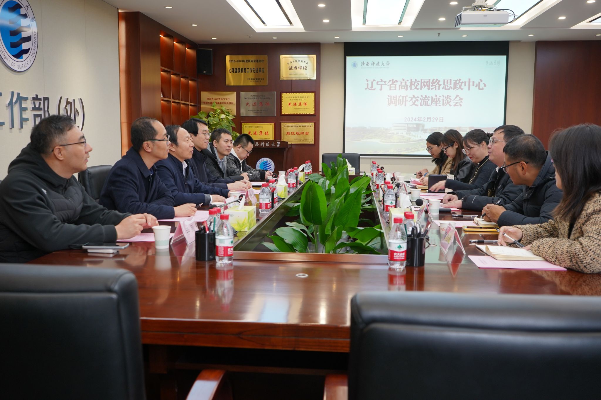 座谈会上,网络思政中心主任(陕西高校网络思想政治工作中心办公室负责人)对辽宁省中心一行的到来表示欢迎,他从学校“三创两迁”办学历程、办学规模、学科建设、发展成就等方面介绍了学校的基本情况,并对承建的省校两级网络思政工作平台的整体布局和运行体系进行了介绍。希望以此次调研交流为契机,两中心进一步加深友谊,建立起互联共建的长效机制,特别是在深化网络思政科学研究、加大网络原创作品供给、健全数字思政体制机制等方面更加广泛的工作中开展更多实质深入的交流与合作,共同营造向上向善的网络思想舆论空间。