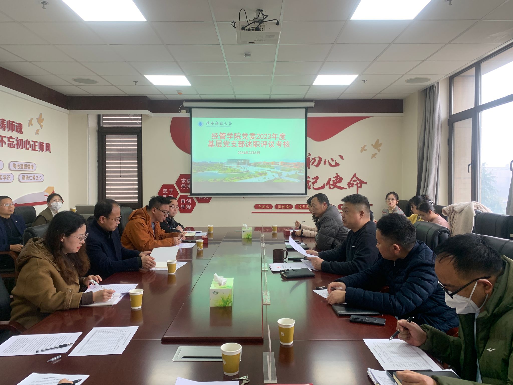 根据校党委关于开展基层党建述职评议考核的相关要求,经济与管理学院(亚欧贸易与数字经济学院)党委于3月5日下午在人文楼A415召开2023年度基层党支部述职评议考核会议。学院党委委员和全体教工、学生党支部书记参加会议,学院党委书记崔楠主持会议并做点评。
