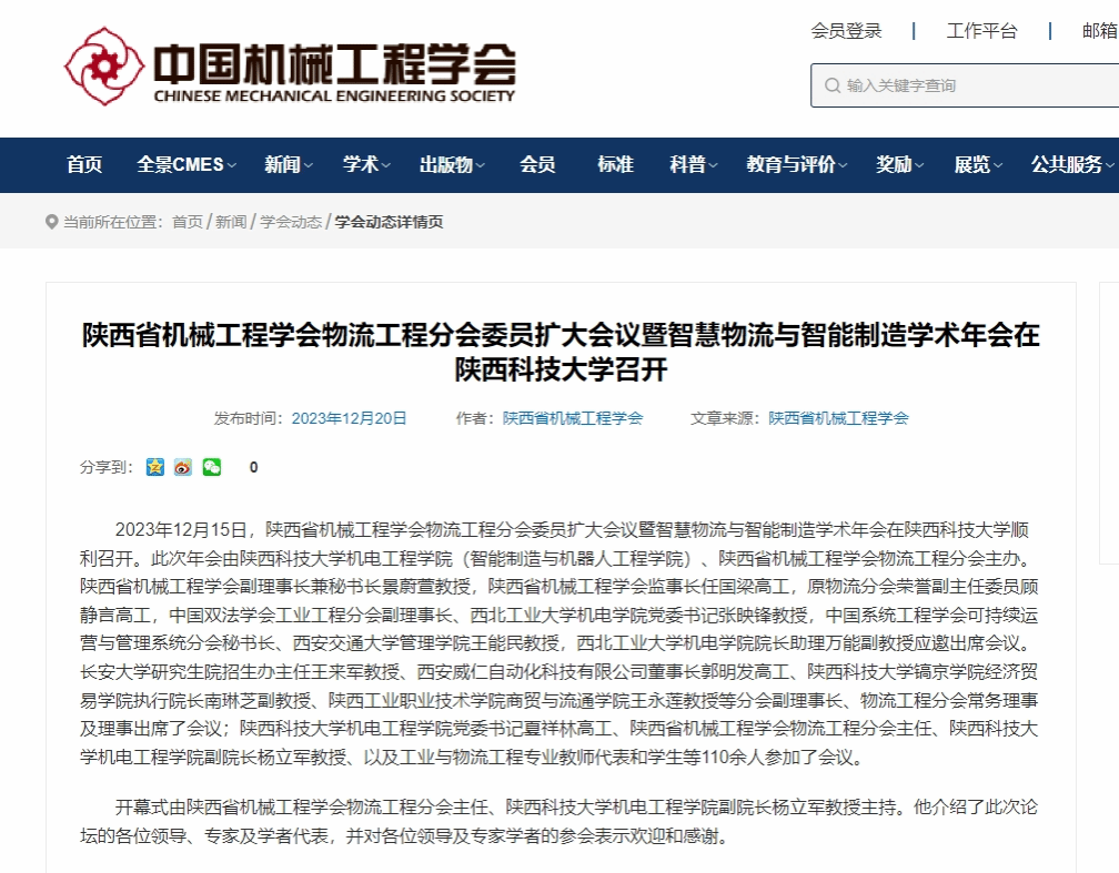 近日,中国机械工程学会官网报道陕西省机械工程学会物流工程分会委员扩大会议暨智慧物流与智能制造学术年会在365官网召开。
