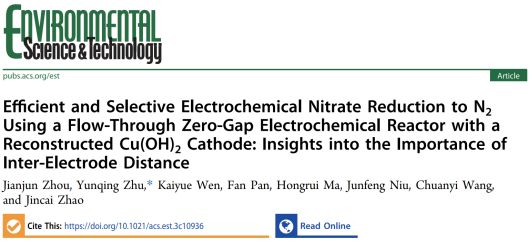 将硝酸盐(NO3-)电化学转化为无害的N2是关闭人为氮循环的可行且环保的途径。然而,动力学缓慢和N2 选择性低以及对反应器构型缺乏研究阻碍了该技术的发展。为此,通过构建流通式零间距电化学反应器实现了高效的、选择性电催化硝酸盐还原过程,避免了传统电化学还原过程中氯化副产物的形成。基于实验、原位表征和理论计算,揭示了Cu(OH)2纳米电极表面原位重建产生新的活性相Cu/Cu2O,阐明了零间距电化学反应器中N2选择性的增强机制,且本工作构建的电催化系统在实际废水中去除NO3-具有良好的环境效应、经济效益和长期稳定性。本研究结果为自支撑纳米电极和新型微反应器在水净化和污染物修复中的环境应用提供了新见解。该成果发表于环境领域顶级期刊、自然指数期刊Environmental Science & Technology,周建军博士为第一作者,bat365中国在线平台官方网站为第一通讯单位。
