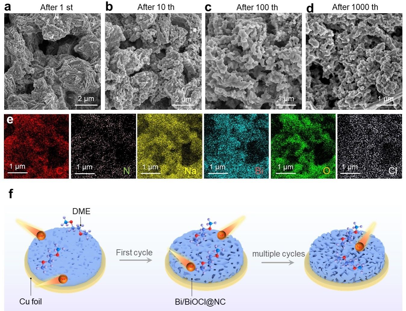 由于原料储量丰富且成本低廉,钠离子电池受到了前所未有的关注。然而,由于缺乏具有快速充电能力和极高稳定性的替代负极材料,钠离子电池的广泛应用受到了阻碍。为了应对这一挑战,本论文开发了一种能够快速充电的钠离子电池负极材料,即嵌入氮掺杂碳框架的Bi/BiOCl(Bi/BiOCl@NC),该负极材料具有快速的Na+传输通道和超高的结构稳定性。在乙醚电解质中循环时,Bi/BiOCl@NC会发生显著的结构转变,形成三维多孔骨架结构,这有利于增加Na+传输通道和缩减Na+传输距离,并能适应充放电过程中的体积变化。通过密度泛函理论计算模拟Na+在该结构中的储存行为,发现Bi/BiOCl@NC具有较低的Na+传输势垒(0.056 eV)和出色的电子导电性。独特的结构使得Bi/BiOCl@NC负极材料在20 A g–1条件下具有410 mAh g–1的超高Na+储存能力,并能在10 A g–1的高电流密度条件下稳定循环超过2300次,这一结果刷新了已报道的钠离子电池负极材料的性能表现。这项工作为钠离子电池提供了一种极具前景的负极材料,并将激励研究人员开发出更多的新型储能系统。