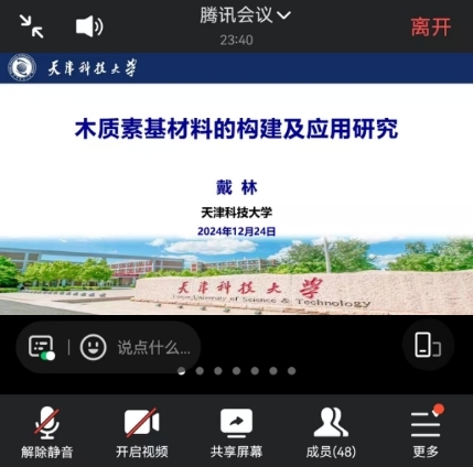 12月26日,应轻工科学与工程学院(柔性电子学院)和科技处、前沿院邀请,天津科技大学戴林教授做客365官网“前沿科学报告”,并作了题为“木质素基材料的构建及应用研究”的线上学术报告。本次前沿科学报告由轻工学院党旭岗副教授主持,学院相关教师和全体研究生参加了本次报告会。